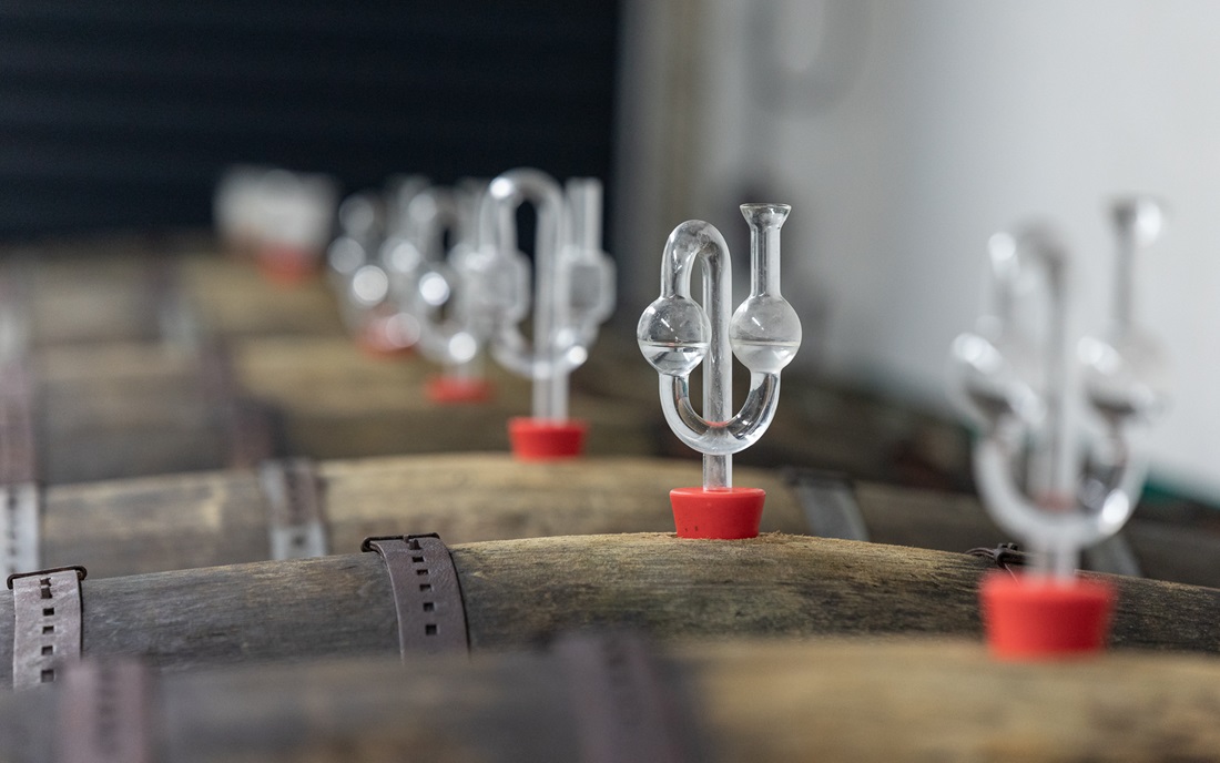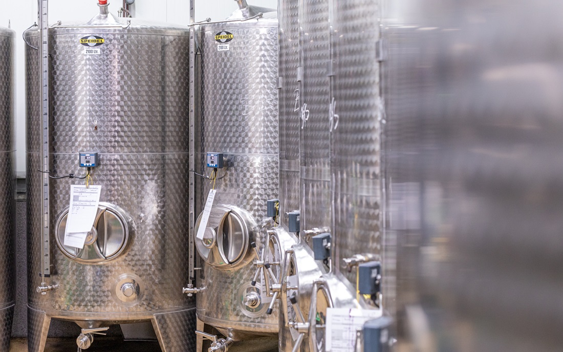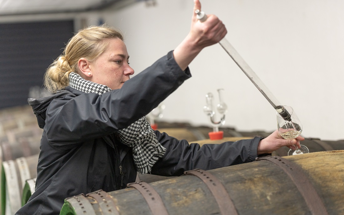 Im Keller angekommen ist es unsere Aufgabe, die qualitätsfördernden Inhaltsstoffe des Weinbergs möglichst unbeschadet von der Traube in den Wein zu bringen. Die Trauben werden zunächst gekeltert, also gepresst. Dabei entstehen Traubenmost und Trester. Aus dem Trester werden in der hauseigenen Brennerei feine Destillate gebrannt. Der noch trübe Traubenmost wird in unsere insgesamt 200.000 Liter Füllmenge umfassenden Holzfässer und gekühlten Edelstahltanks gefüllt, um darin weiterverarbeitet zu werden. Durch die ständig überwachte und gekühlte Gärung entsteht nach der Filtration ein klarer, milder Wein der je nach Restsüße die entsprechende Geschmacksrichtung bildet. Diese sind trocken, halbtrocken, feinherb lieblich und edelsüß.